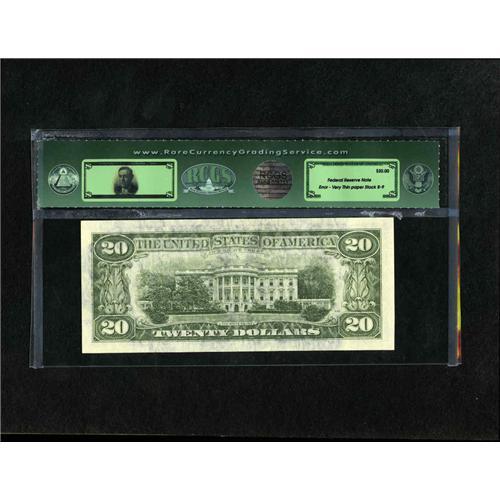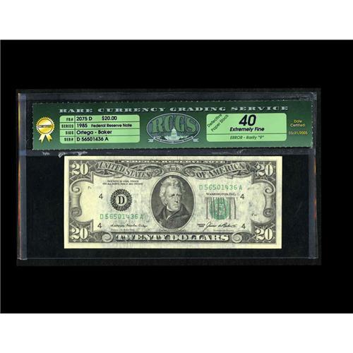 <B>Fr. 2075-D $20 1985 Federal Reserve Note. RCGS Extremely Fine 40.</B></I> A very scarce error with the note otherwise normally printed but for the fact that the paper stock is extremely thin, resulting in areas where the back printing can bee seen through the face.