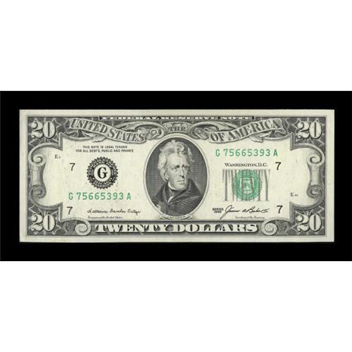 <B>Fr. 2075-G $20 1985 Federal Reserve Note. Crisp Uncirculated.</B></I><BR> A couple of minor corner bumps at left account for the grade on this otherwise gem note.<BR><BR><b>Shipping:</b> Coins & Currency (<a target="_blank" href="http://www.heritageauctions.com/common/shipping.php">view shipping information</a>)