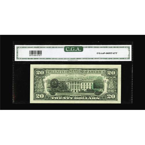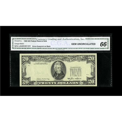 <B>Fr. 2075-L $20 1985 Federal Reserve Note. CGA Gem Uncirculated 66.</B></I><BR>A well preserved third printing on back note that shows strong embossing on its face.