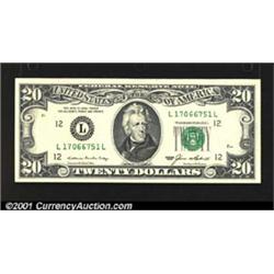 Fr. 2075-L $20 1985 Federal Reserve Note.<p>Gem Crisp Uncirculated. A pristine blank reverse example. Important notice: We expect to be auctioning lots at the rate of 200-250 per hour. Sometimes eBay Premier live bid software cannot keep up with that pace, so we strongly recommend that you place a realistic proxy bid now as insurance to avoid disappointment. Also please note that all Heritage/CAA lots purchased through eBay Premier carry a 20% Buyer's Premium.