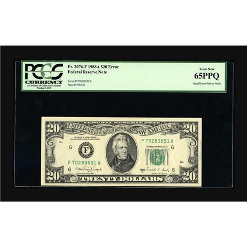 <B>Fr. 2076-F $20 1988A Federal Reserve Note. PCGS Gem New 65PPQ.</B></I><BR>About 75% of the back is missing on this early $20 FRN.<BR><BR><b>Shipping:</b> Coin/Currency (<a target="_blank" href="http://www.heritageauctions.com/common/shipping.php">view shipping information</a>)