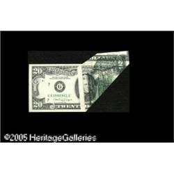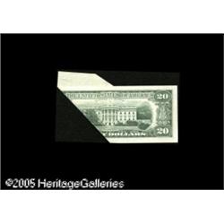 <B>Fr. 2076-G $20 1988A Federal Reserve Note. Choice New.</B></I><BR>A complex multiple-fold cutting and obstruction error with a normal third print, but with a substantial portion of the face blank and a fairly large portion of the face printed on the back. This one must be examined to be properly appreciated. Lot:15293