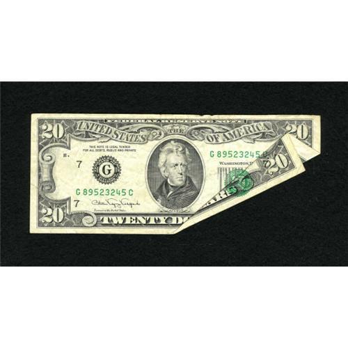 <B>Fr. 2076-G $20 1988A Federal Reserve Note. Very Fine.</B></I><BR> A neat printed fold is noticed on this Chicago $20 FRN.<BR><BR><b>Shipping:</b> Coins & Currency (<a target="_blank" href="http://www.heritageauctions.com/common/shipping.php">view shipping information</a>)