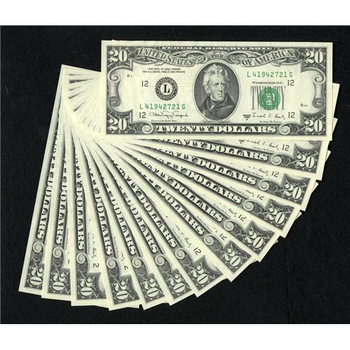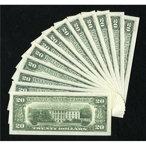 <B>Fr. 2076 Thirteen $20 1988A Federal Reserve Notes. Gem Crisp Uncirculated.</B></I><BR>A completely gem group of twenties with twelve of the notes from the 1988A New York and San Francisco districts and a lone 1985 example.<BR><BR><b>Shipping:</b> Coins & Currency (<a target="_blank" href="http://www.heritageauctions.com/common/shipping.php">view shipping information</a>)