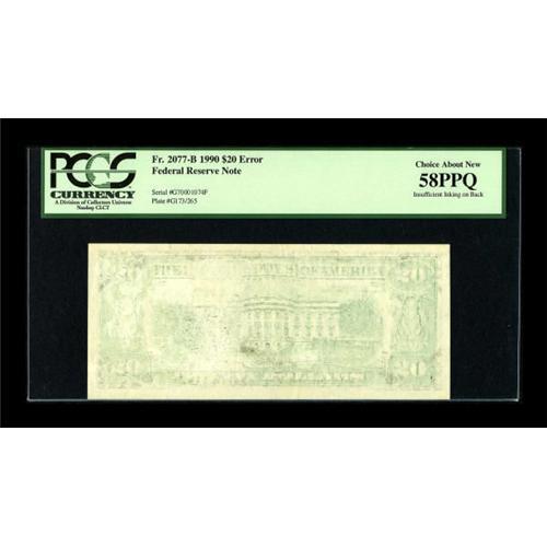<B>Fr. 2077-B $20 1990 Federal Reserve Note. PCGS Choice About New 58PPQ.</B></I><BR> Insufficient inking of the back has left a ghostly green imprint visible.<BR><I>From The Amelia Island Collection.</B></I><BR><BR><b>Shipping:</b> Coins & Currency (<a target="_blank" href="http://www.heritageauctions.com/common/shipping.php">view shipping information</a>)
