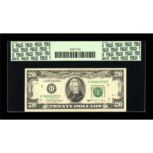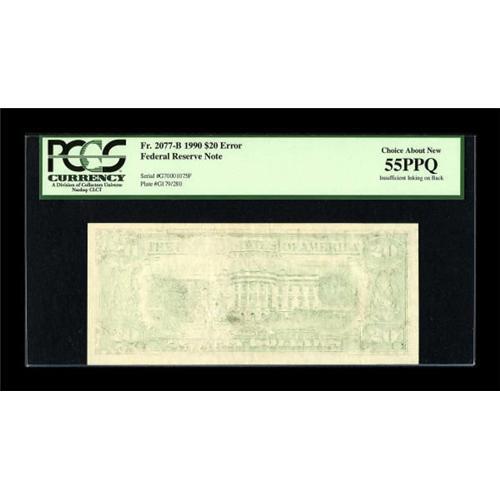<B>Fr. 2077-B $20 1990 Federal Reserve Note. PCGS Choice About New 55PPQ.</B></I><BR> This example is consecutive to the last note and exhibits the same light reverse printing as the plate was severely underinked.<BR><I>From The Amelia Island Collection.</B></I><BR><BR><b>Shipping:</b> Coins & Currency (<a target="_blank" href="http://www.heritageauctions.com/common/shipping.php">view shipping information</a>)