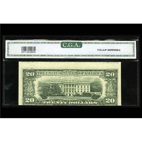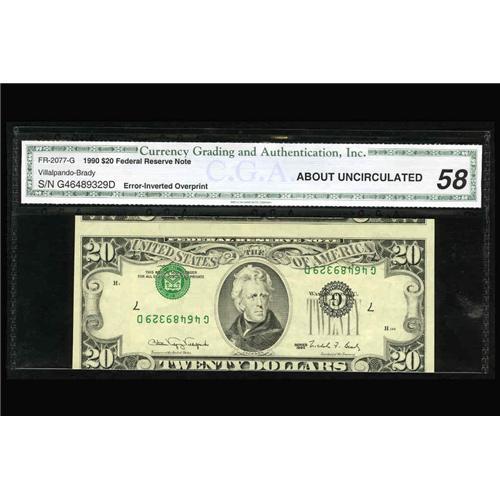 <B>Fr. 2077-G $20 1990 Federal Reserve Note. CGA About Uncirculated 58.</B></I> This is a very desirable high grade Type 2 invert.