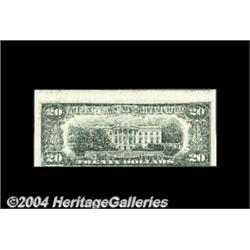 Fr. 2077-G $20 1990 Federal Reserve Note. Choice Crisp Uncirculated.This is a multiple error note that has an upside down third printing, plus the note is miscut with a portion of the note above displayed. <BR><BR><B>Important notice:</B> Heritage usually auctions material at the rate of 200-250 lots per hour. On some occasions eBay Live bid software or the Internet may not be able to keep up with the pace of the auction. We recommend placing a realistic absentee bid now as insurance to avoid disappointment. Occasionally the auctioneer may eliminate or reject an eBay Live bid, and the auctioneer may also reopen a lot after the close of the eBay live bidding (usually because we missed an audience bid), and may reject your bid even if it shows you as the winning bidder. By bidding via eBay Live, you agree that Heritage may award the lot to another bidder at its sole discretion under the circumstances described above or any other reasonable circumstances. Since eBay bids are not shown to us until we open the lot on the floor, we treat those bids just like floor bids. In most cases the floor responds before the eBay bid is presented to us, due to Internet lag time, so for consistency we have made it a policy that floor bids are always considered first over tie eBay live bids. Also please note that all Heritage lots purchased through eBay Live carry a 20% Buyer's Premium. Please make sure you read the Terms and Conditions before you bid. <BR><BR><B>IMPORTANT ANNOUNCEMENT ABOUT RESERVES:</B> Heritage now divulges all reserves on its web site 7 days before every auction. If you want to know whether the reserve on this lot has been met, and if not, what the reserve amount is, please visit this lot page on the HeritageCoin.com web site, or email: bid@HeritageGalleries.com