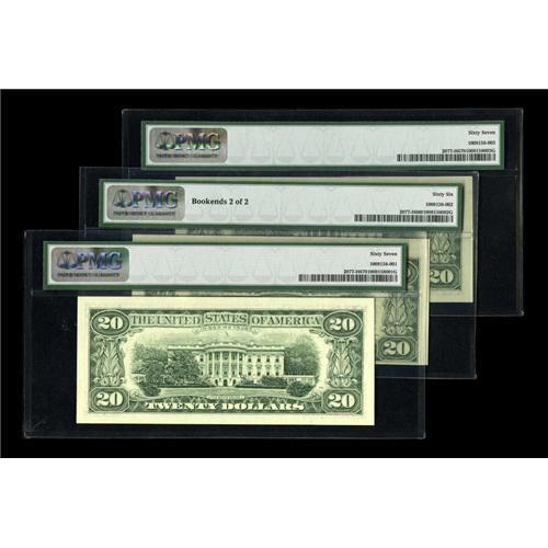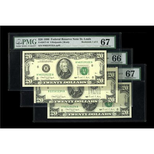 <B>Fr. 2077-H $20 1990 Federal Reserve Notes. Three Examples PMG Gem Uncirculated 66, Superb Gem Unc 67.</B></I><BR>This interesting trio consists of a neat Type II invert error sandwiched between bookends.<BR><BR><b>Shipping:</b> Coins & Currency (<a target="_blank" href="http://www.heritageauctions.com/common/shipping.php">view shipping information</a>)