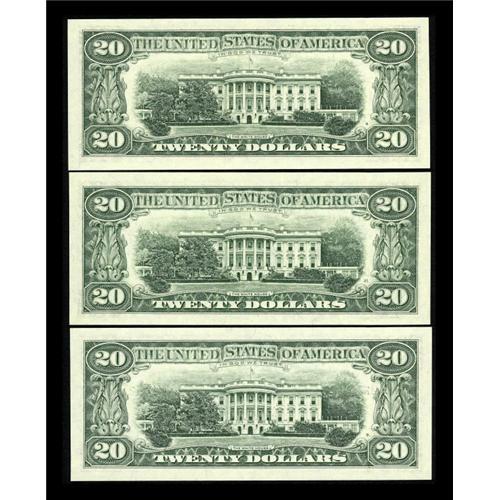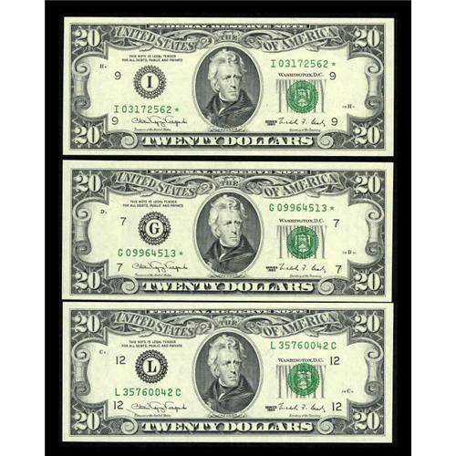 <B>Fr. 2078-G*; I*; L $20 1990 Federal Reserve Notes. Gem Crisp Uncirculated.</B></I><BR> The Western Currency Facility in Forth Worth came online during the production of the Series 1990 $20s. This lot represents three of the four different $20s Fort Worth printed for this series.<BR><I>From The Thomas M. Flynn Collection</B></I><BR><BR><b>Shipping:</b> Coins & Currency (<a target="_blank" href="http://www.heritageauctions.com/common/shipping.php">view shipping information</a>)