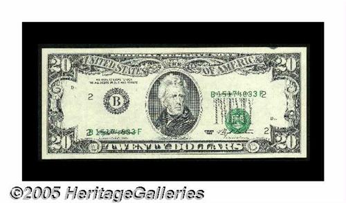 <B>Fr. 2079-B $20 1993 Federal Reserve Note. Extremely Fine-About Uncirculated.</B></I> Light handling and a spot of ATM ink along the top edge are seen on this $20 that has the overprint shifted low enough to overlay the Withrow-Bentsen signatures.
