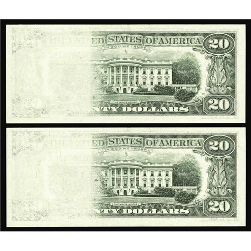 <B>Fr. 2079-B $20 1993 Federal Reserve Notes. Two Consecutive Examples Choice Crisp Uncirculated.</B></I><BR>This pair has suffered from a portion of the back design being missing at left. A very faint ghost image of the missing design is visible.<BR>