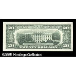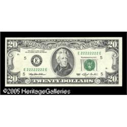 <B>Fr. 2079-E $20 1993 Federal Reserve Note. Choice About Uncirculated.</B></I><BR>A Richmond $20 with solid serial E22222222E and kept from a higher grade by a single light fold to the right of the portrait. As nice an example as any Choice or Gem Uncirculated piece from the standpoint of overall aesthetics. Lot:16181
