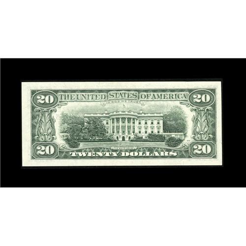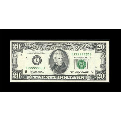 <B>Fr. 2079-E $20 1993 Federal Reserve Note. Choice About Uncirculated.</B></I><BR>A lovely Richmond district $20 bearing solid serial number E22222222E. It's kept from an even higher grade by a single light fold to the right of the portrait. Ex-lot 16181 of our Taylor Family Collection sale, where it realized $1560.