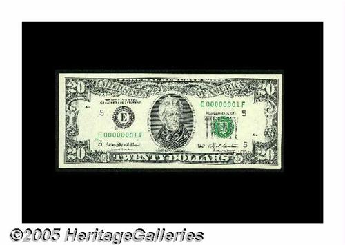 <B>Fr. 2079-E $20 1993 Federal Reserve Note. Very Choice Crisp Uncirculated.</B></I><BR>In later years, serial number 1s were not to escape the Fed's grasp, but this E00000001F $20 certainly did. The serial numbers display minute ink smearing, but this will not detract this $20 from becoming a showpiece for the next collection it enters.