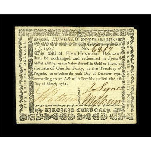 <B>Virginia March 1, 1781 $500 Extremely Fine.</B></I> This thick paper variety sustained only a few light folds, only one of which is readily visible on the face. The signatures are strong, though there is a corner nick and some weakness in the center fold that must be noted.<BR><BR><b>Shipping:</b> Coins & Currency (<a target="_blank" href="http://www.heritageauctions.com/common/shipping.php">view shipping information</a>)