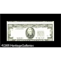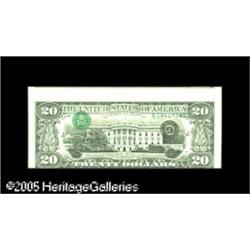 <B>Fr. 2080-G $20 1993 Federal Reserve Note. Choice Crisp Uncirculated.</B></I> A nice double error from the Ft. Worth BEP facility with the trim badly shifted upward so that the lower margin is cut well into the design and a portion of the note above on the sheet shows. The third printing is inverted on the reverse. Lot:15391