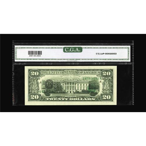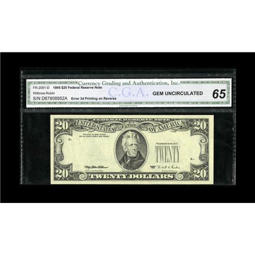 <B>Fr. 2081-D $20 1995 Federal Reserve Note. CGA Gem Uncirculated 65.</B></I><BR>A very pristine example of this error with excellent centering and wide margins.