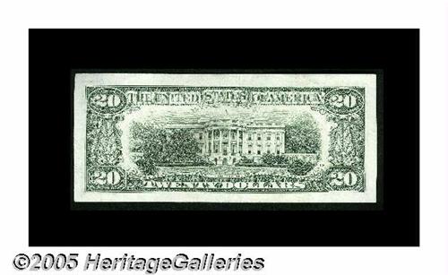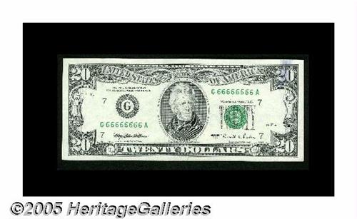 <B>Fr. 2082-G $20 1995 Federal Reserve Note. About Uncirculated.</B></I><BR>Solid serial number G66666666A. There is a small ink smear at the top right which is barely worthy of mention.