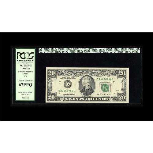 <B>Fr. 2082-G $20 1995 Federal Reserve Note. PCGS Superb Gem New 67PPQ.</B></I><BR>This simply stunning note carries ascending ladder serial number G23456789C.<BR><I>From the Scottsdale Collection</B></I>