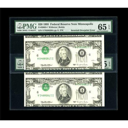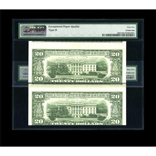 <B>Fr. 2082-I $20 1995 Federal Reserve Notes. Two Consecutive Examples. PMG Gem Uncirculated 65 EPQ.</B></I><BR> This is simply as gorgeous a pair of Type II inverts as one could ever expect to find. The margins are pleasing and the embossing clearly visible. Expect some strong competition to acquire this interesting duo.<BR><BR><b>Shipping:</b> Coins & Currency (<a target="_blank" href="http://www.heritageauctions.com/common/shipping.php">view shipping information</a>)