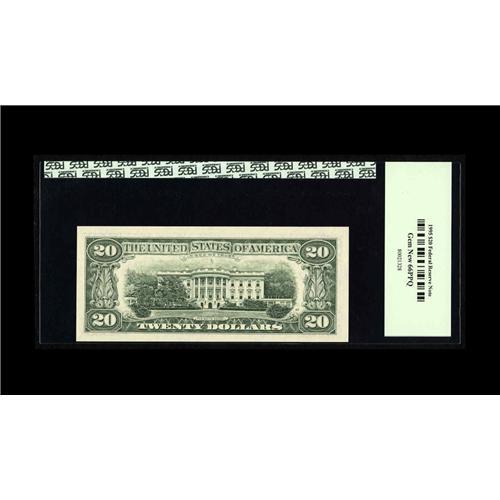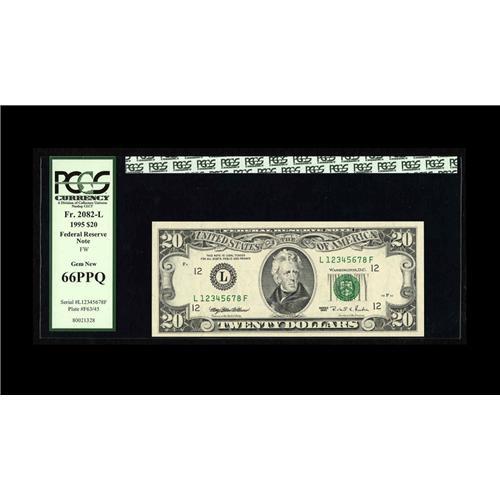 <B>Fr. 2082-L $20 1995 Federal Reserve Note. PCGS Gem New 66PPQ.</B></I><BR>The ascending ladder serial number is second most sought after fancy number type behind the serial number one note. This example which is quite bright will be a welcome addition to any fancy number collection.<BR><I>From the Scottsdale Collection</B></I>