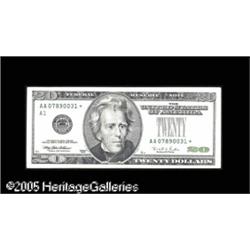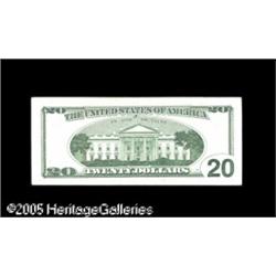 <B>Fr. 2083-A* $20 1996 Federal Reserve Note. Extremely Fine.</B></I><BR>An obstruction error has prevented the green treasury seal from printing. This is a minor error that becomes far more important as it is a Star note. Lot:15359