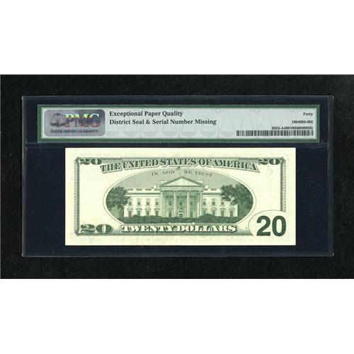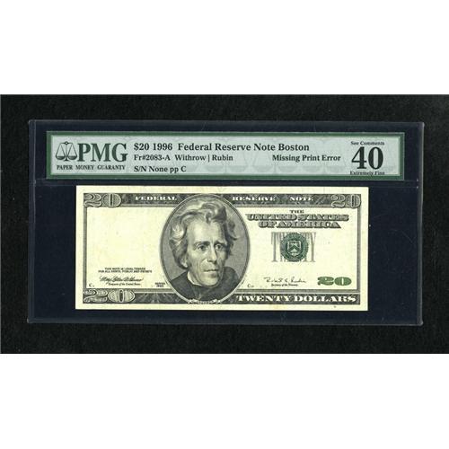 <B>Fr. 2083-A $20 1996 Federal Reserve Note. PMG Extremely Fine 40.</B></I><BR>The third print is completely missing on this lightly circulated note.<BR><BR><b>Shipping:</b> Coins & Currency (<a target="_blank" href="http://www.heritageauctions.com/common/shipping.php">view shipping information</a>)