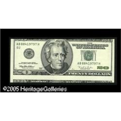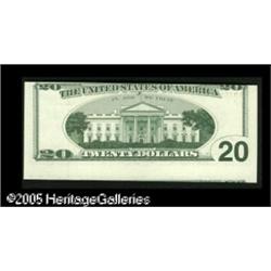 <B>Fr. 2083-B $20 1996 Federal Reserve Note. Choice Crisp Uncirculated.</B></I> This miscut $20 has a top margin at the crown of Jackson's head, while the bottom margin ends within the portrait of the succeeding note. Lot:15392