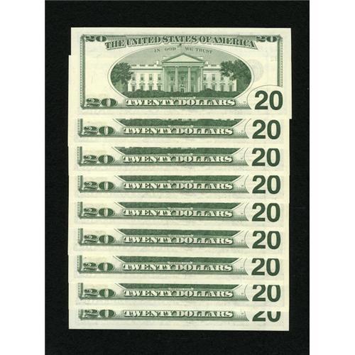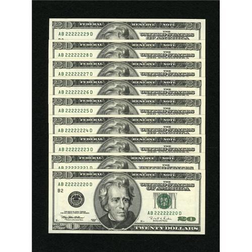 <B>Fr. 2083-B $20 1996 Federal Reserve Notes. Nine Examples Gem Crisp Uncirculated.</B></I><BR> This run is missing only the solid serial number two example and every note carries seven consecutive twos.<BR><BR><b>Shipping:</b> Coins & Currency (<a target="_blank" href="http://www.heritageauctions.com/common/shipping.php">view shipping information</a>)