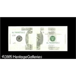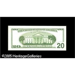 <B>Fr. 2083-L $20 1996 Federal Reserve Note. Gem New.</B></I><BR>This new $20 is missing all of its magnetic ink which is clear from the distinct pattern formed by this error, but additionally the remainder of the first face printing is also massively under-inked and the color shifting "20" is very well embossed, but totally un-inked. A fascinating error which we've handled only once before when we sold this piece. Lot:15366