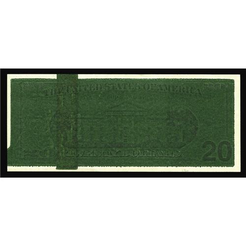<B>Fr. 2084-G $20 1996 Federal Reserve Note. Extremely Fine-About Uncirculated.</B></I> A dramatic inking error has covered the entire reverse with what appears about two gallons of green ink. There is also a vertical strip of green ink which is clearly evident but otherwise inexplicable to us.