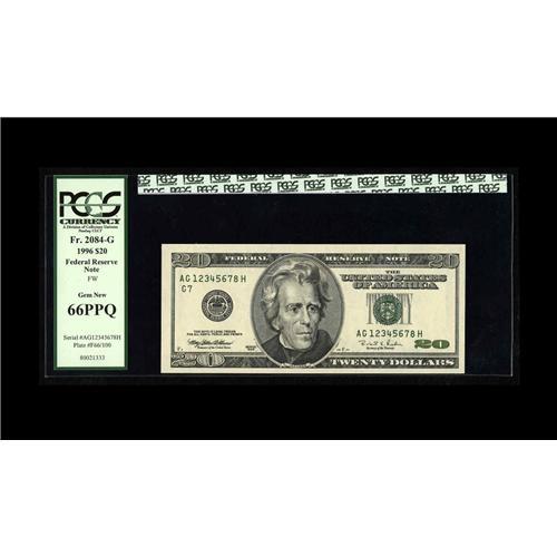 <B>Fr. 2084-G $20 1996 Federal Reserve Note. PCGS Gem New 66PPQ.</B></I><BR>This wonderful ladder was one of over more than 1.1 billion notes printed at the Ft. Worth facility for the Chicago district.<BR><I>From the Scottsdale Collection</B></I>