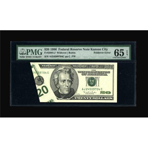 <B>Fr. 2084-J $20 1996 Federal Reserve Note. PMG Gem Uncirculated 65 EPQ.</B></I> An attractive foldover on one of the "New Twenties," which is not a common error, especially in this grade. <BR><BR><b>Shipping:</b> Coins & Currency (<a target="_blank" href="http://www.heritageauctions.com/common/shipping.php">view shipping information</a>)