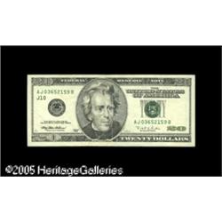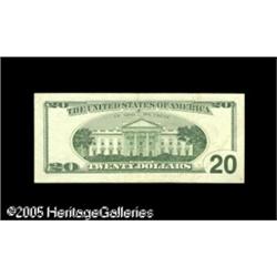 <B>Fr. 2084-J $20 1996 Federal Reserve Note. Very Fine.</B></I> A Ft. Worth printed note with the security strip and watermark incorrectly positioned on the face of the note. Lot:15394