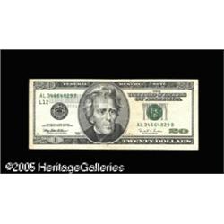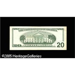 <B>Fr. 2084-L $20 1996 Federal Reserve Note Extremely Fine.</B></I> An enigmatic error which was printed on paper with a bar code embedded in it. It is unquestionably a genuine Bureau produced product, although nobody has been able to suggest a reason the bar code was embedded in what is clearly currency stock. Lot:15395