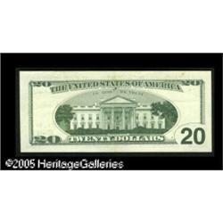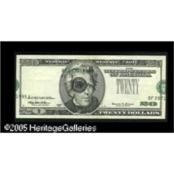 <B>Fr. 2086-F $20 1999 Federal Reserve Note. Extremely Fine.</B></I> The third printing is greatly shifted to the right, thereby the Federal Reserve System seal lands squarely on Jackson's face, while the left and right-hand ends of the note, each display parts of a Treasury seal. Lot:15464