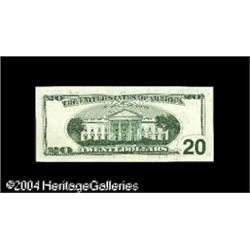 Fr. 2087-B $20 2001 Federal Reserve Note. Gem Crisp U <B>Fr. 2087-B $20 2001 Federal Reserve Note. Gem Crisp Uncirculated.</B></I><BR>Single digit serial number CB0000006A, a lovely and rare example. <BR><BR><B>Important notice:</B> Heritage usually auctions material at the rate of 200-250 lots per hour. On some occasions eBay Live bid software or the Internet may not be able to keep up with the pace of the auction. We recommend placing a realistic absentee bid now as insurance to avoid disappointment. Occasionally the auctioneer may eliminate or reject an eBay Live bid, and the auctioneer may also reopen a lot after the close of the eBay live bidding (usually because we missed an audience bid), and may reject your bid even if it shows you as the winning bidder. By bidding via eBay Live, you agree that Heritage may award the lot to another bidder at its sole discretion under the circumstances described above or any other reasonable circumstances. Since eBay bids are not shown to us until we open the lot on the floor, we treat those bids just like floor bids. In most cases the floor responds before the eBay bid is presented to us, due to Internet lag time, so for consistency we have made it a policy that floor bids are always considered first over tie eBay live bids. Also please note that all Heritage lots purchased through eBay Live carry a 20% Buyer's Premium. Please make sure you read the Terms and Conditions before you bid. This lot is being auctioned in conjunction with a live floor auction by Heritage Galleries & Auctioneers. All final auction and invoice information will be supplied by Heritage Galleries & Auctioneers, and all other information should be considered preliminary. Lot:16398