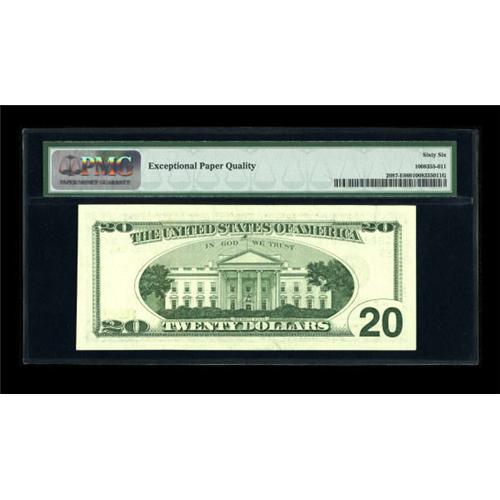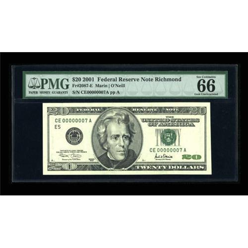 <B>Fr. 2087-E $20 2001 Federal Reserve Note. PMG Gem Uncirculated 66 EPQ.</B></I><BR> This piece is a perfect match to the Fort Worth printed Serial Number 7 issue offered in this auction. The pieces differ with the blocks ending in A and D respectively for this issue and the Fr. 2088-E.<BR><BR><b>Shipping:</b> Coins & Currency (<a target="_blank" href="http://www.heritageauctions.com/common/shipping.php">view shipping information</a>)