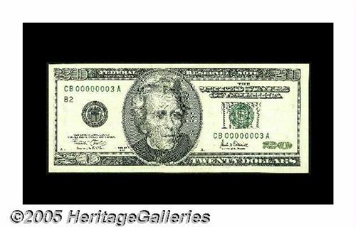 <B>Fr. 2088-B $20 2001 Federal Reserve Note. Choice Crisp Uncirculated.</B></I><BR>Serial number 3 graces this $20 that possesses minute handling.