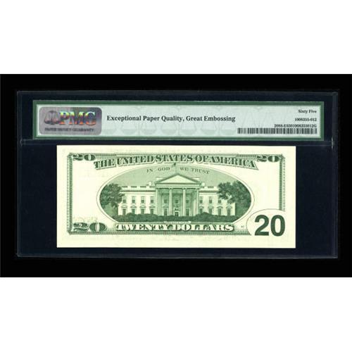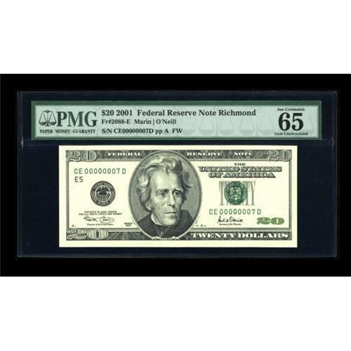 <B>Fr. 2088-E $20 2001 Federal Reserve Note. PMG Gem Uncirculated 65 EPQ.</B></I><BR> In our FUN Signature Auction two years ago we featured the Serial Number 1 note. The Serial Number 7 issue printed in Washington is also available in this auction. PMG added the comment "Great Embossing".<BR><BR><b>Shipping:</b> Coins & Currency (<a target="_blank" href="http://www.heritageauctions.com/common/shipping.php">view shipping information</a>)