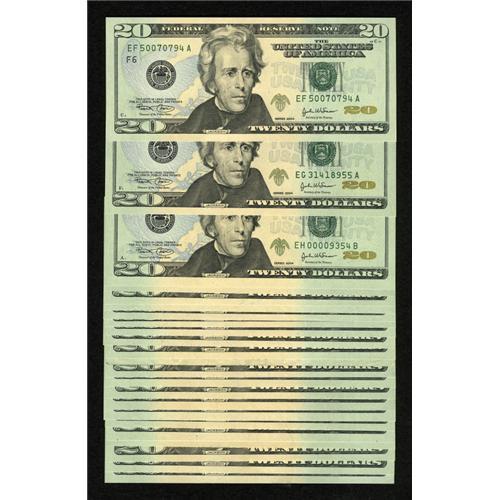 <B>Fr. 2089-A-F; A*-C*; E* $20 2004 Federal Reserve Notes. Choice CU or Better<BR>Fr. 2090-D-L; F*; G*; J*; L* $20 2004 Federal Reserve Notes. Choice CU or Better.</B></I><BR> A couple of these notes have serial numbers under 10,000. Only one note is below the assigned grade and it is a <B>Fine-Very Fine</B></I> Fr. 2089-E. <BR><I>From The Thomas M. Flynn Collection</B></I><BR><BR><b>Shipping:</b> Coins & Currency (<a target="_blank" href="http://www.heritageauctions.com/common/shipping.php">view shipping information</a>)