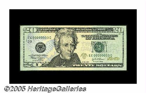 <B>Fr. 2089-C $20 2004 Federal Reserve Note. Gem Crisp Uncirculated.</B></I><BR>Serial number 3 graces this $20 of the new multi-colored persuasion.