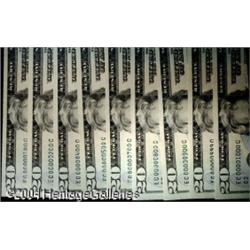 Fr. 2089-C $20 2004 Federal Reserve Notes. Gem Crisp <B>Fr. 2089-C $20 2004 Federal Reserve Notes. Gem Crisp Uncirculated.</B></I><BR>A neat run of fancy serial numbers, including EC00000100C, EC00000200C, EC00000400C, EC00000500C, EC00000700C, EC00000800C, EC00000900C, EC00000999C, and EC00001000C. 9 notes <BR><BR><B>Important notice:</B> Heritage usually auctions material at the rate of 200-250 lots per hour. On some occasions eBay Live bid software or the Internet may not be able to keep up with the pace of the auction. We recommend placing a realistic absentee bid now as insurance to avoid disappointment. Occasionally the auctioneer may eliminate or reject an eBay Live bid, and the auctioneer may also reopen a lot after the close of the eBay live bidding (usually because we missed an audience bid), and may reject your bid even if it shows you as the winning bidder. By bidding via eBay Live, you agree that Heritage may award the lot to another bidder at its sole discretion under the circumstances described above or any other reasonable circumstances. Since eBay bids are not shown to us until we open the lot on the floor, we treat those bids just like floor bids. In most cases the floor responds before the eBay bid is presented to us, due to Internet lag time, so for consistency we have made it a policy that floor bids are always considered first over tie eBay live bids. Also please note that all Heritage lots purchased through eBay Live carry a 20% Buyer's Premium. Please make sure you read the Terms and Conditions before you bid. This lot is being auctioned in conjunction with a live floor auction by Heritage Galleries & Auctioneers. All final auction and invoice information will be supplied by Heritage Galleries & Auctioneers, and all other information should be considered preliminary. Lot:16411