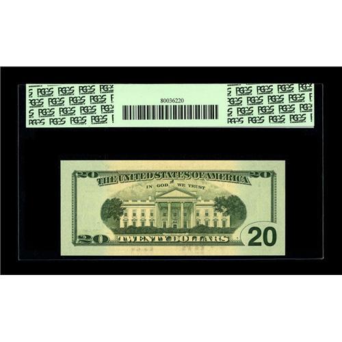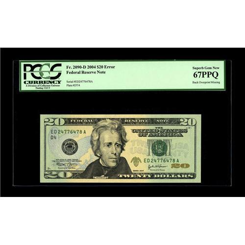 <B>Fr. 2090-D $20 2004 Federal Reserve Note. PCGS Superb Gem New 67PPQ.</B></I><BR>This is a new type of error. The tiny gold-colored $20s that are normally on the back are missing from this Cleveland note. PCGS has noted it as such on the holder.<BR><BR><b>Shipping:</b> Coin/Currency (<a target="_blank" href="http://www.heritageauctions.com/common/shipping.php">view shipping information</a>)