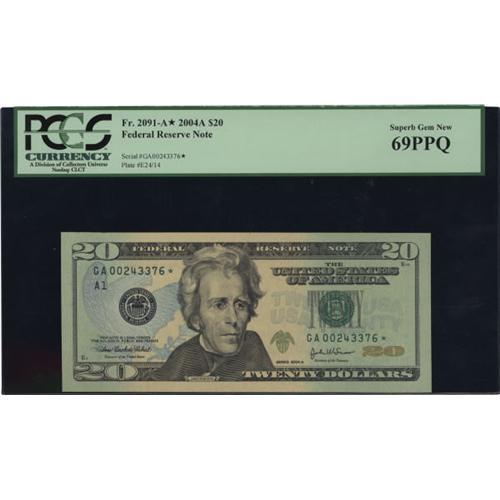 <B>Fr. 2091-A* $20 2004A Federal Reserve Note. PCGS Superb Gem New 69PPQ.</B></I><BR> This replacement is perfectly printed, well embossed, and boasts a near-perfect grade.<BR><BR><b>Shipping:</b> Coins & Currency (<a target="_blank" href="http://www.heritageauctions.com/common/shipping.php">view shipping information</a>)