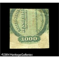 Fr. 210 $1,000 1861 Interest Bearing Note Partial Clipp <B>Fr. 210 $1,000 1861 Interest Bearing Note Partial Clipping Very Fine.</B></I> This interesting item is a clipping, measuring approximately 2 1/2 inches square, from a genuine 1861 $1,000 Interest Bearing Note. There are no known specimens of this note other than a few proofs, and this is one of only two partial clippings that we have ever seen. The face of this note features Salmon Chase (perhaps this clipping was saved for this engraving), and the reverse has an ornate design stating the obligation due. While a complete example of one of these notes would certainly be much more impressive, this item is a "must have" for the collector who wants one of everything. <BR><BR><B>Important notice:</B> Heritage usually auctions material at the rate of 200-250 lots per hour. On some occasions eBay Live bid software or the Internet may not be able to keep up with the pace of the auction. We recommend placing a realistic absentee bid now as insurance to avoid disappointment. Occasionally the auctioneer may eliminate or reject an eBay Live bid, and the auctioneer may also reopen a lot after the close of the eBay live bidding (usually because we missed an audience bid), and may reject your bid even if it shows you as the winning bidder. By bidding via eBay Live, you agree that Heritage may award the lot to another bidder at its sole discretion under the circumstances described above or any other reasonable circumstances. Since eBay bids are not shown to us until we open the lot on the floor, we treat those bids just like floor bids. In most cases the floor responds before the eBay bid is presented to us, due to Internet lag time, so for consistency we have made it a policy that floor bids are always considered first over tie eBay live bids. Also please note that all Heritage lots purchased through eBay Live carry a 20% Buyer's Premium. Please make sure you read the Terms and Conditions before you bid. This lot is being auctioned in conjunction with a live floor auction by Heritage Galleries & Auctioneers. All final auction and invoice information will be supplied by Heritage Galleries & Auctioneers, and all other information should be considered preliminary. Lot:17055