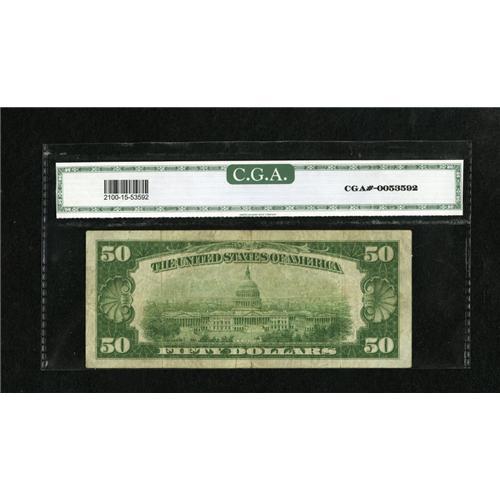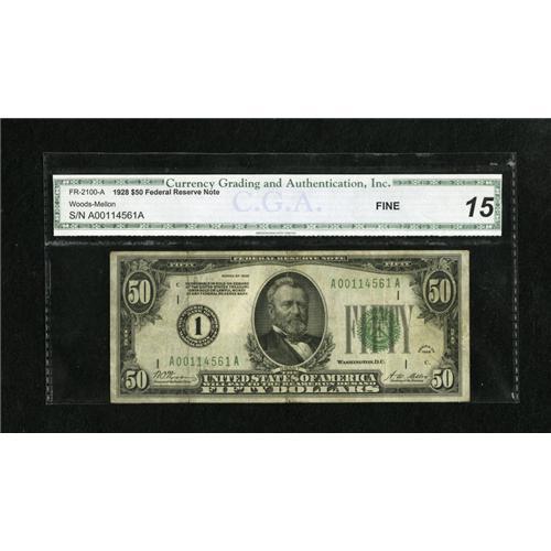 <B>Fr. 2100-A $50 1928 Federal Reserve Note. CGA Fine 15.</B></I><BR>Most of the examples that we have offered of this very scarce Boston district have been CU or nearly so. This example is moderately well circulated and therefore within the reach of the budget-minded FRN collector.<BR><BR><b>Shipping:</b> Coins & Currency (<a target="_blank" href="http://www.heritageauctions.com/common/shipping.php">view shipping information</a>)