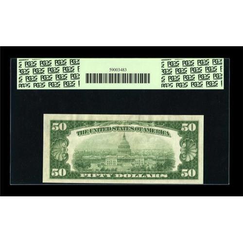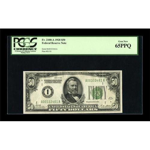 <B>Fr. 2100-A $50 1928 Federal Reserve Note. PCGS Gem New 65PPQ.</B></I><BR> This certainly is one of the keys to completing a set of notes for all districts within the series. Our offerings in the past five years number about ten with this bright example being one of the nicest around. Throw the price guides away on this one.<BR><BR><b>Shipping:</b> Coins & Currency (<a target="_blank" href="http://www.heritageauctions.com/common/shipping.php">view shipping information</a>)