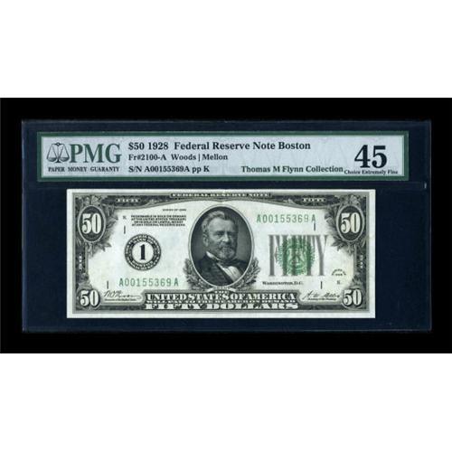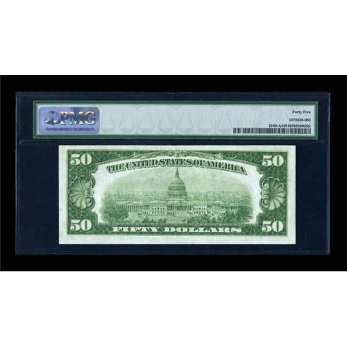 <B>Fr. 2100-A $50 1928 Federal Reserve Note. PMG Choice Extremely Fine 45.</B></I><BR> This is one of the three key districts in the set , the others being Minneapolis and Dallas, and one which is almost impossible to obtain in new condition. Despite an obvious centerfold, this is a brightly colored and quite attractive example. <BR><I>From The Thomas M. Flynn Collection</B></I><BR><BR><b>Shipping:</b> Coins & Currency (<a target="_blank" href="http://www.heritageauctions.com/common/shipping.php">view shipping information</a>)